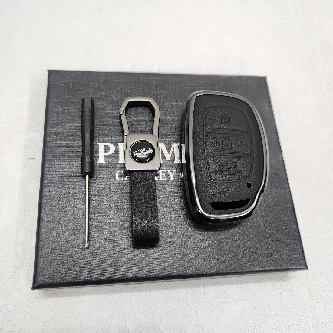 Hyundai Creta/i20/Venue/Aura 3 Button Key Exclusive Aluminium Alloy Leather Keycase with Holder & Rope Chain