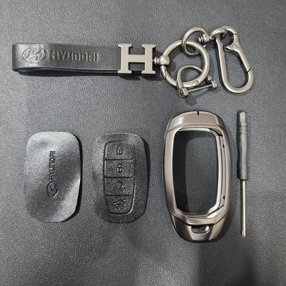 Hyundai Alcazar/Creta/i20 (4 Button Key) Metal Alloy Leather Keycase with Holder & Rope Chain
