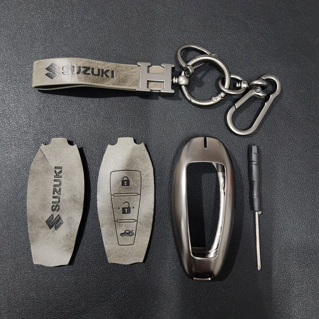 Suzuki 3 Button Key (Ciaz, Baleno, Brezza, S Cross, Ignis) Luxury Metal Alloy Leather Keycase with Holder & Rope Chain