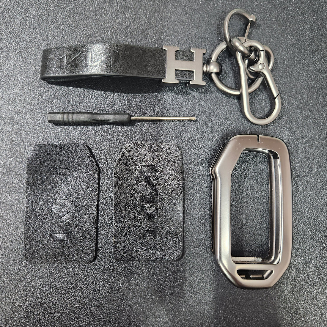 Kia Facelift (Keyless 4 Button Key) Luxury Metal Alloy Leather Keycase with Holder & Rope Chain