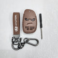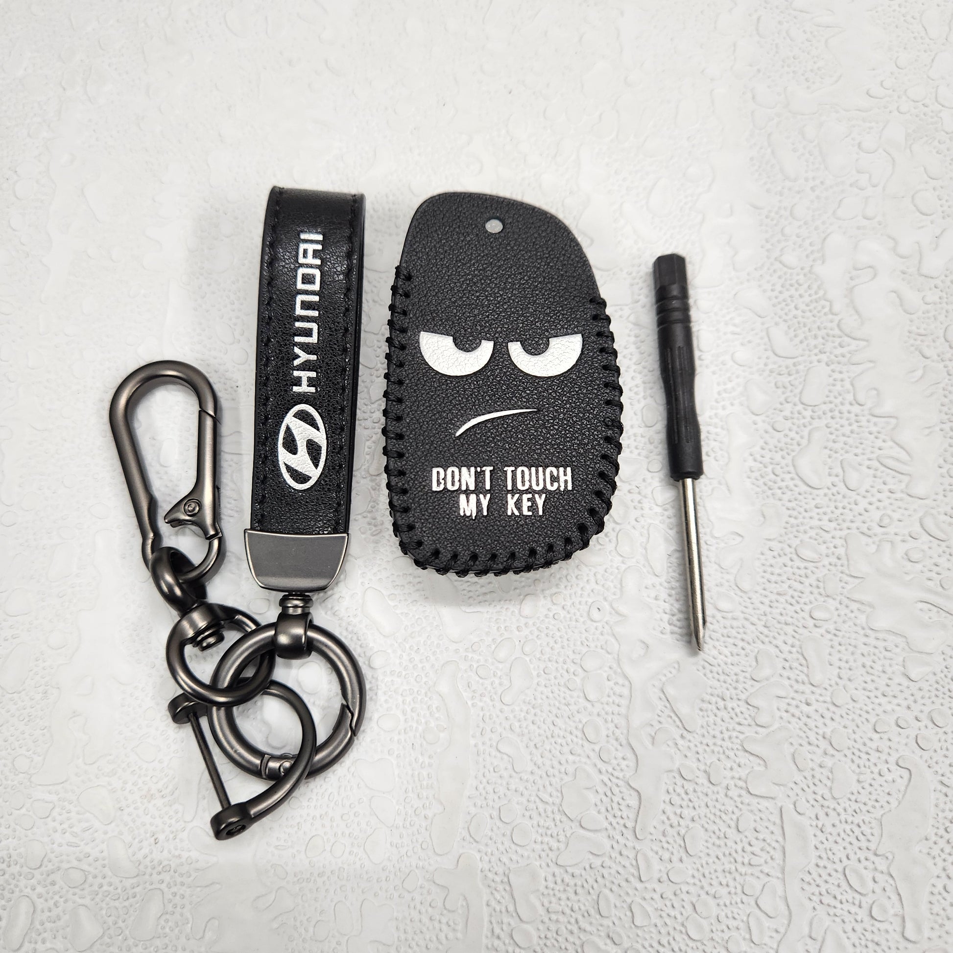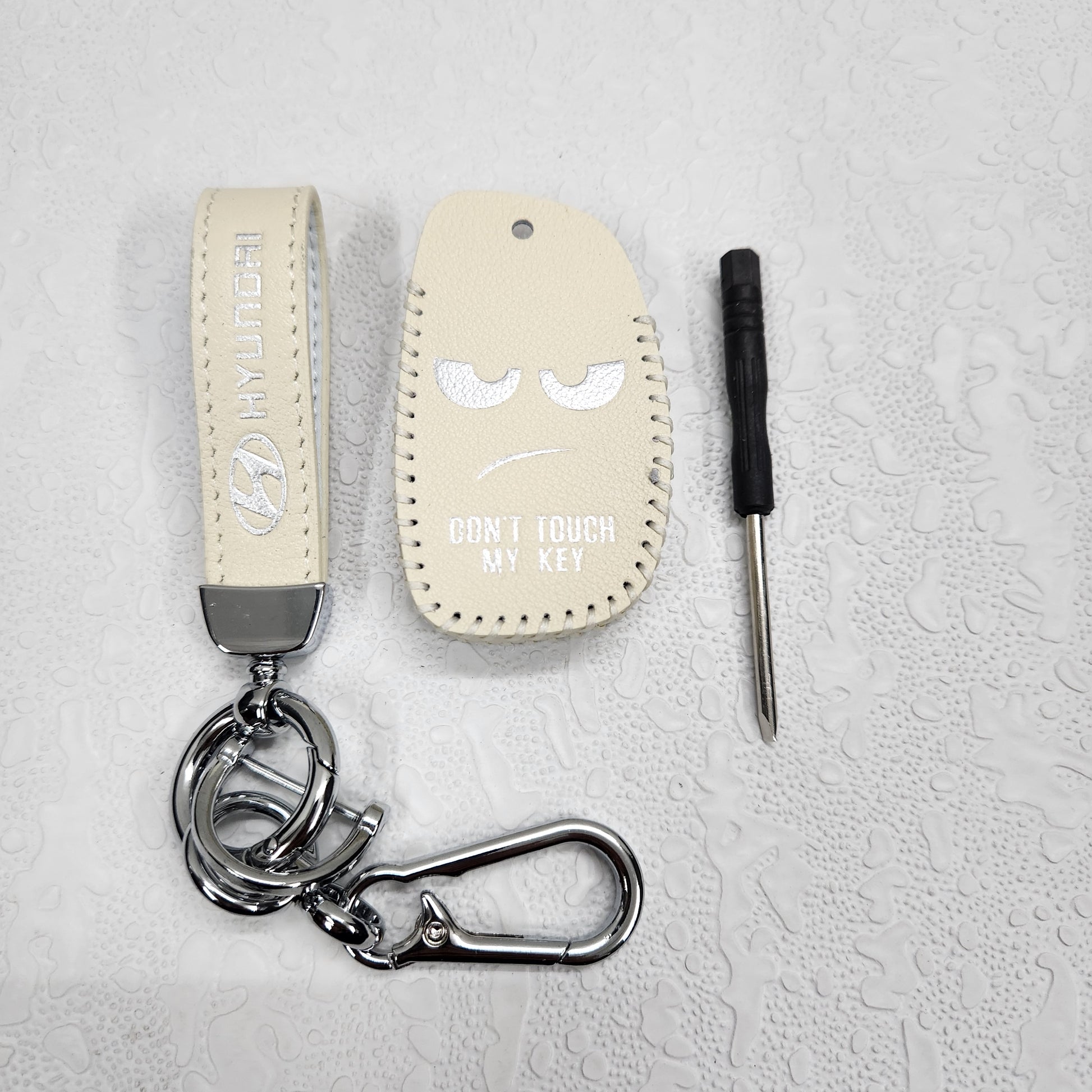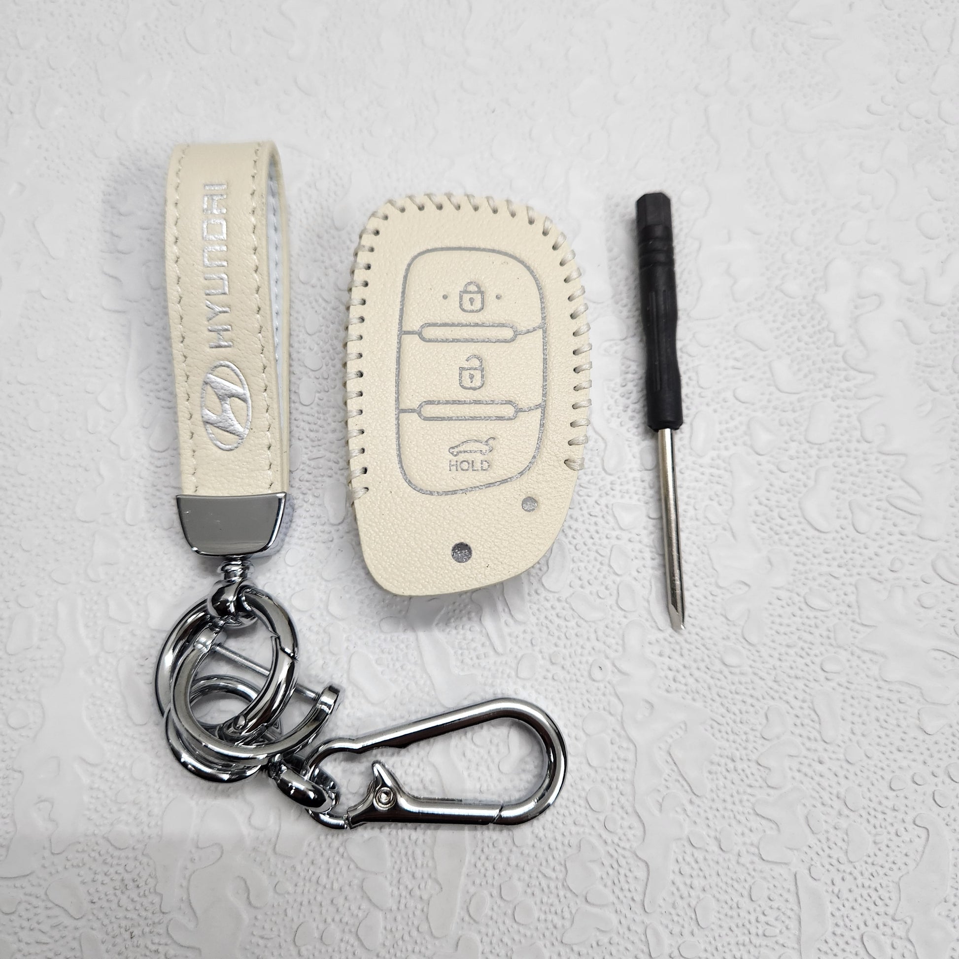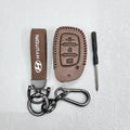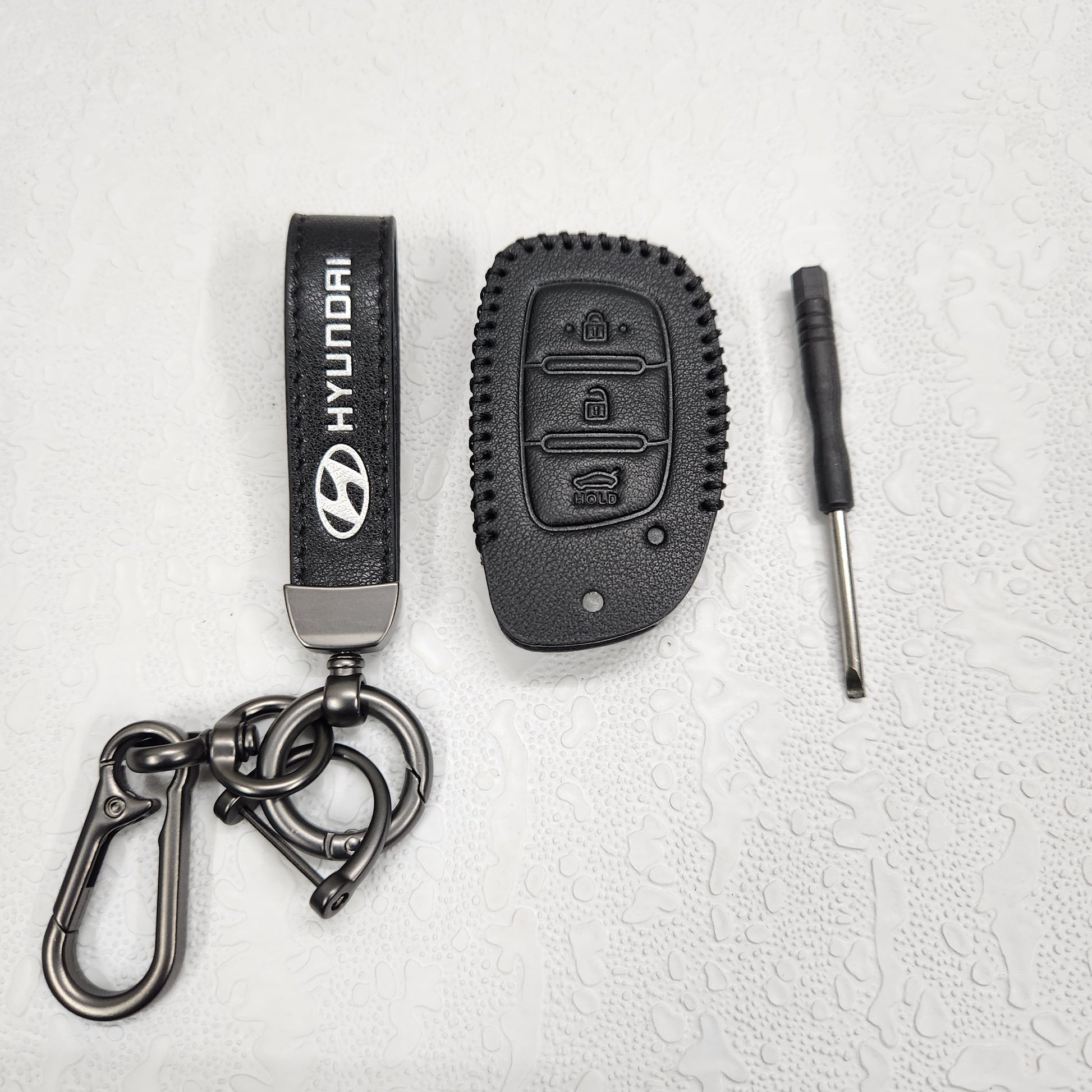 Hyundai Creta/i20/Aura/i10 3 Button Key Luxury Pure Handmade Oilwax Leather Keycase with Logo, Caption, Hook, and Chain