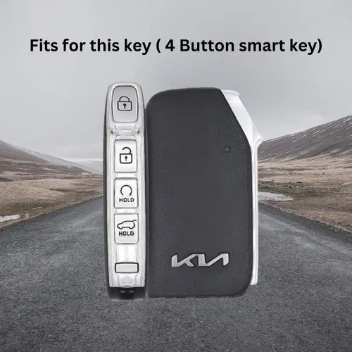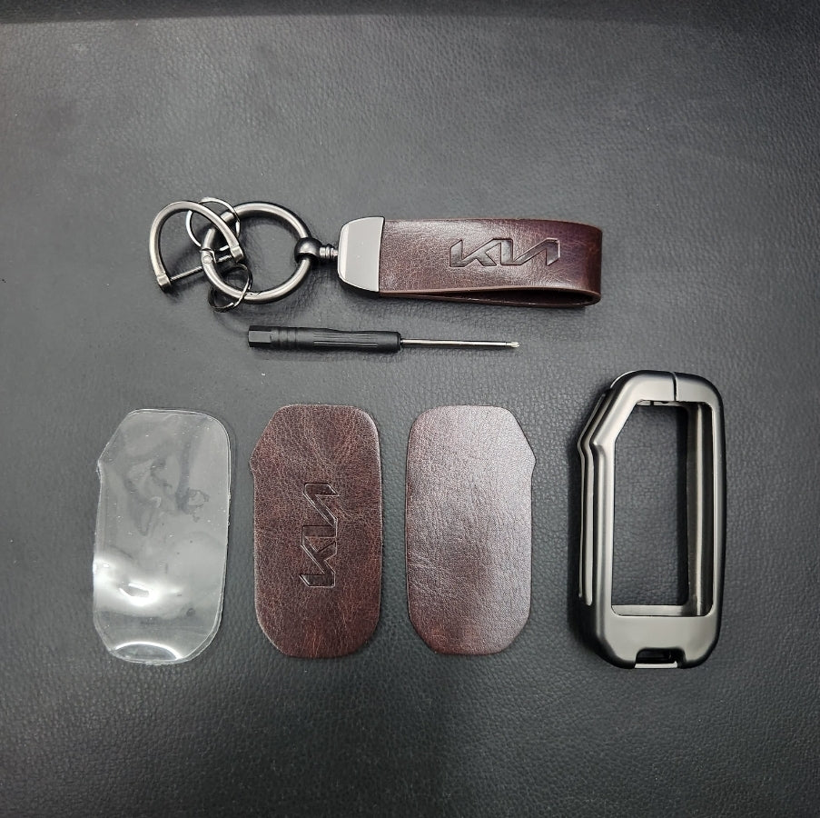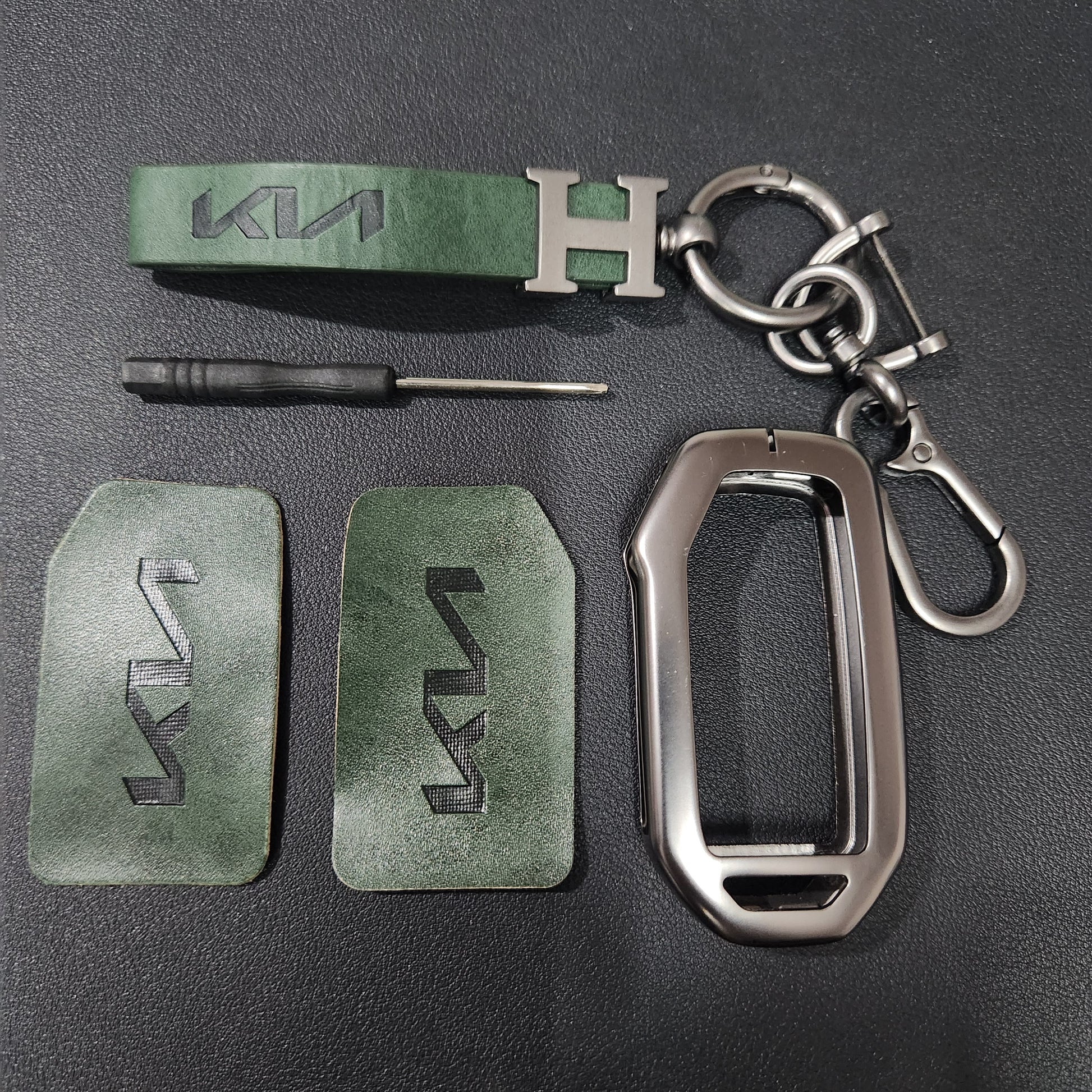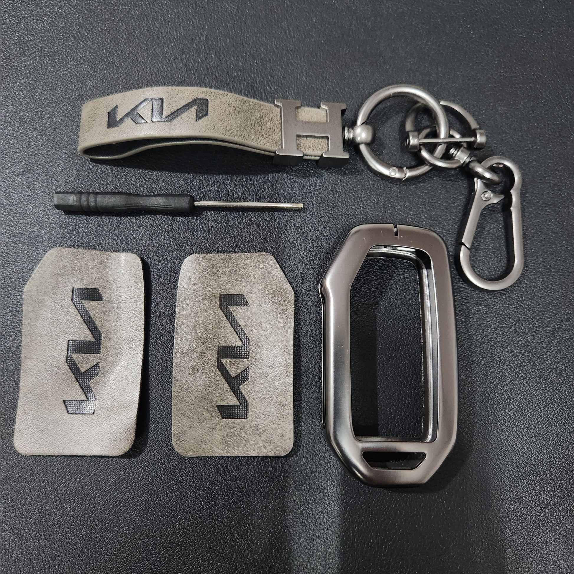 Kia Facelift (Keyless 4 Button Key) Luxury Metal Alloy Leather Keycase with Holder & Rope Chain