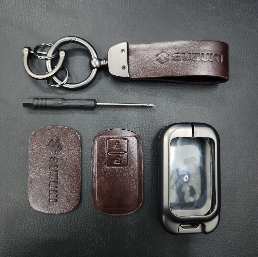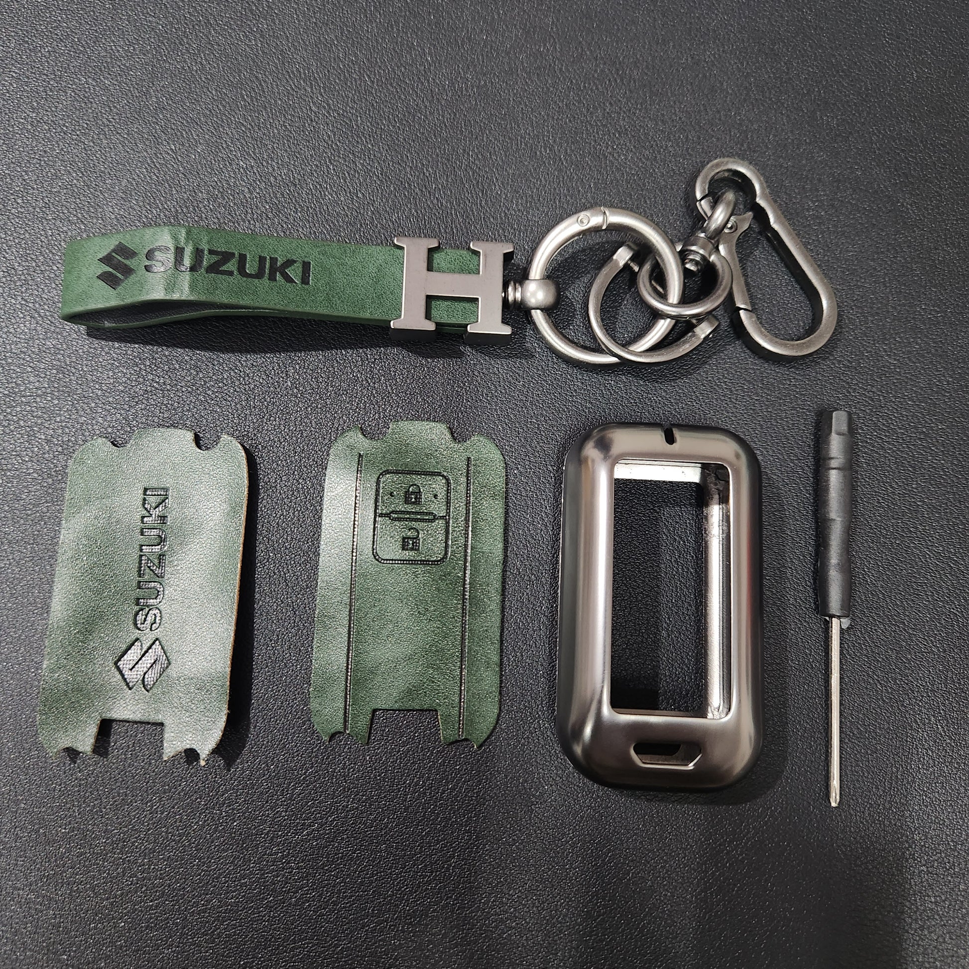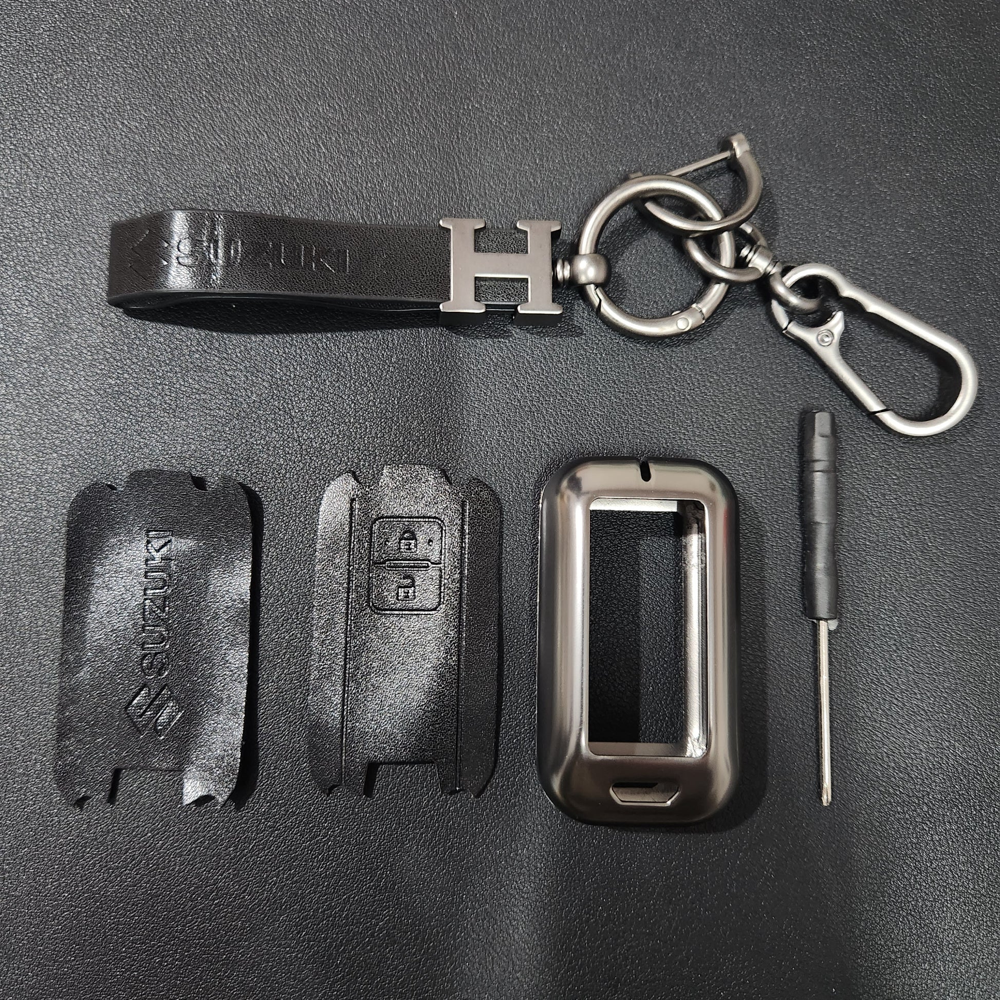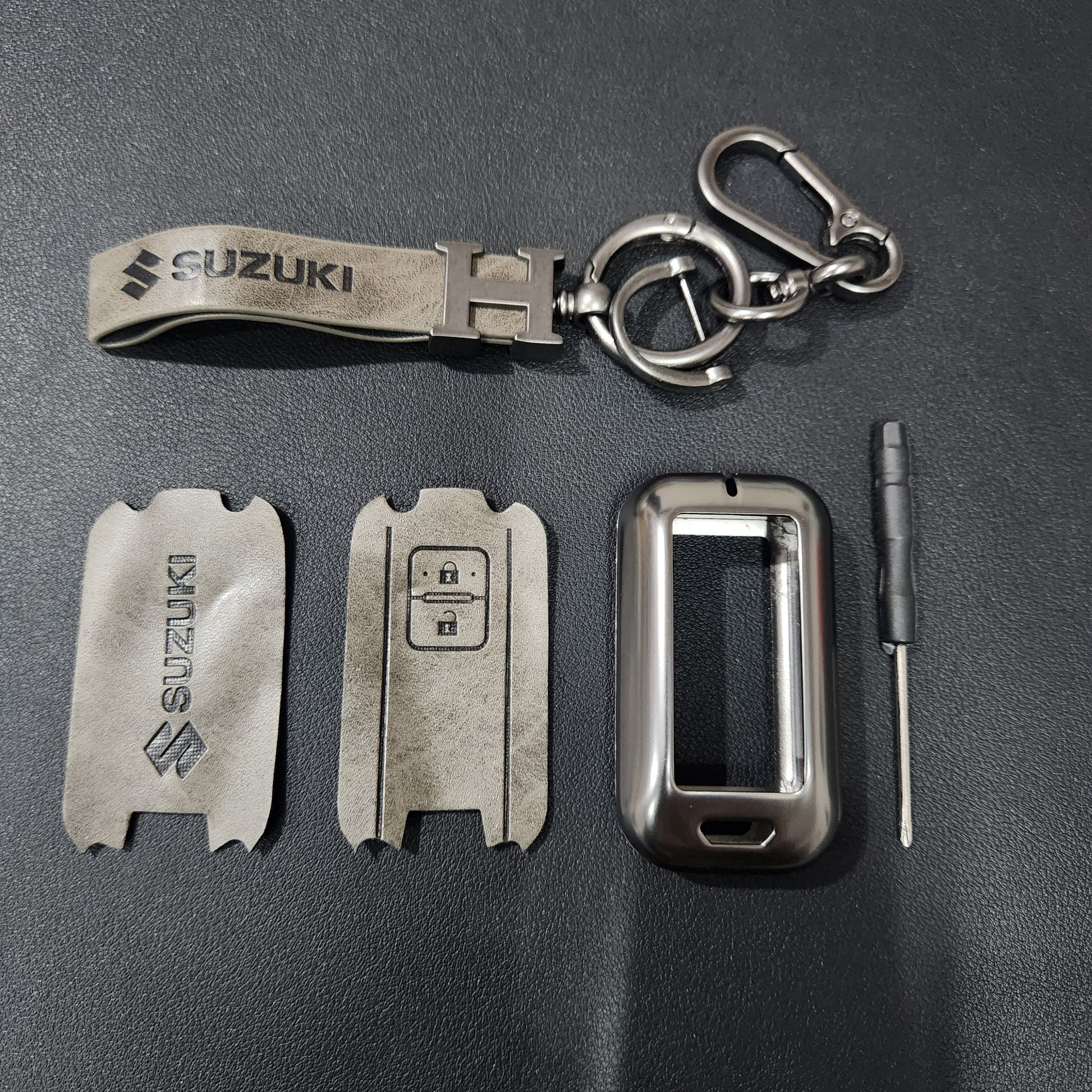 Suzuki 2 Button Key (Baleno, Brezza, S Cross, Swift, Ignis) Luxury Metal Alloy Leather Keycase with Holder & Rope Chain