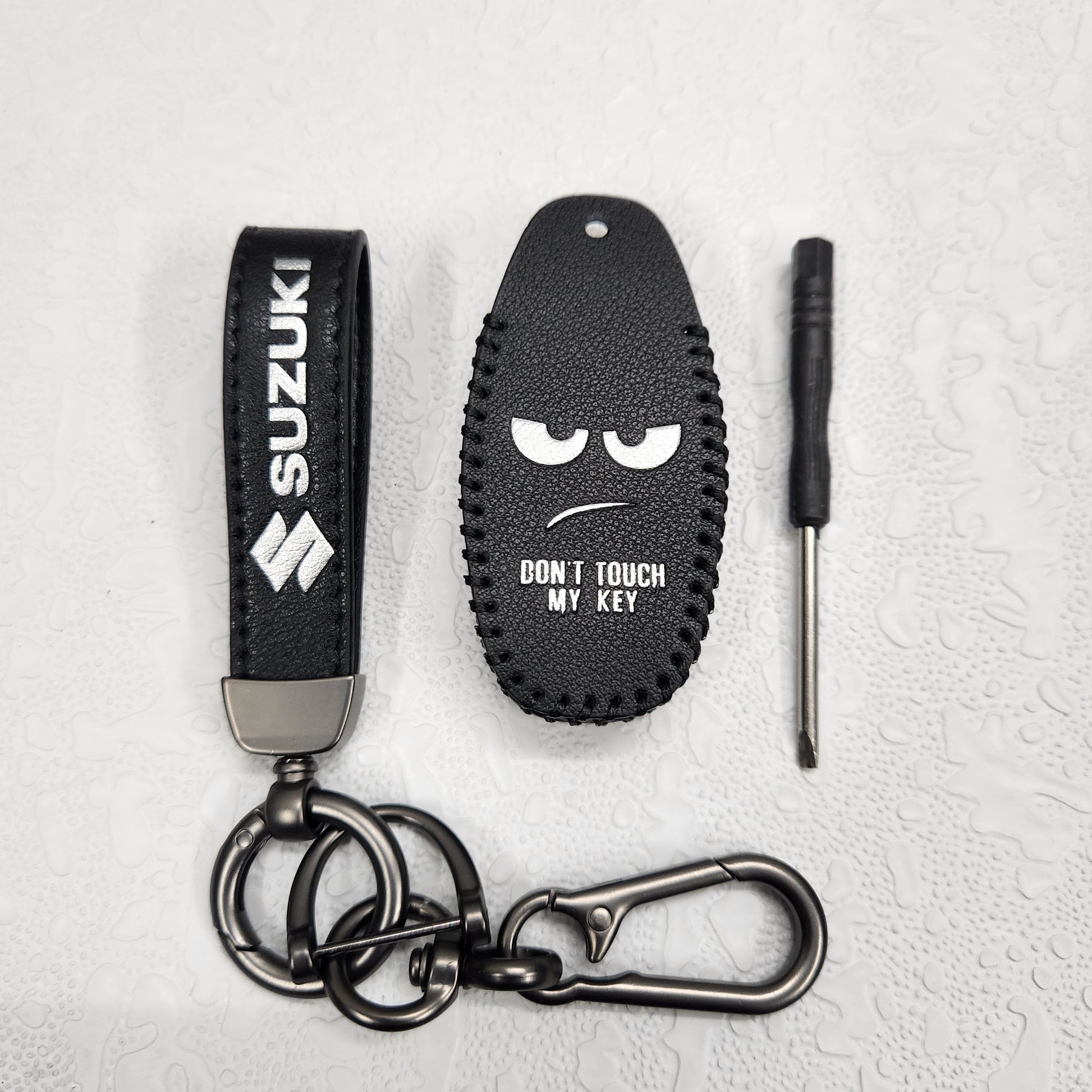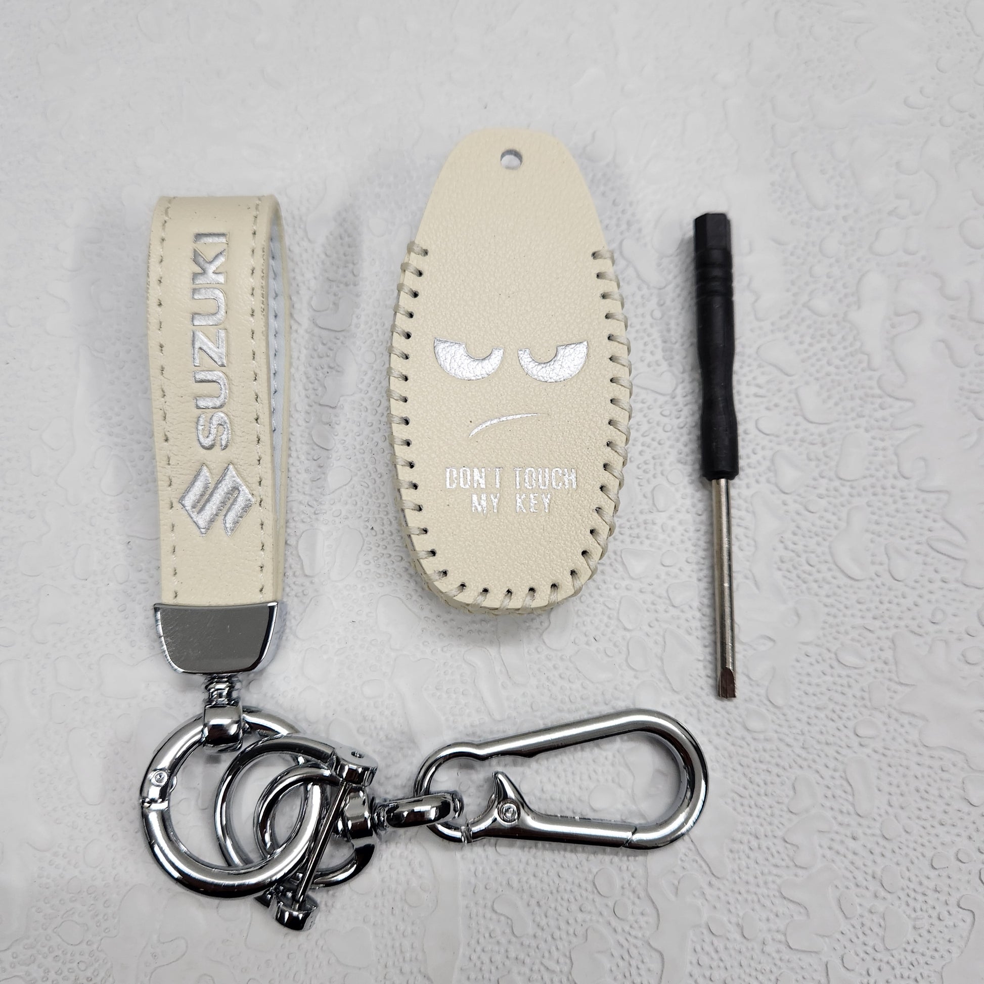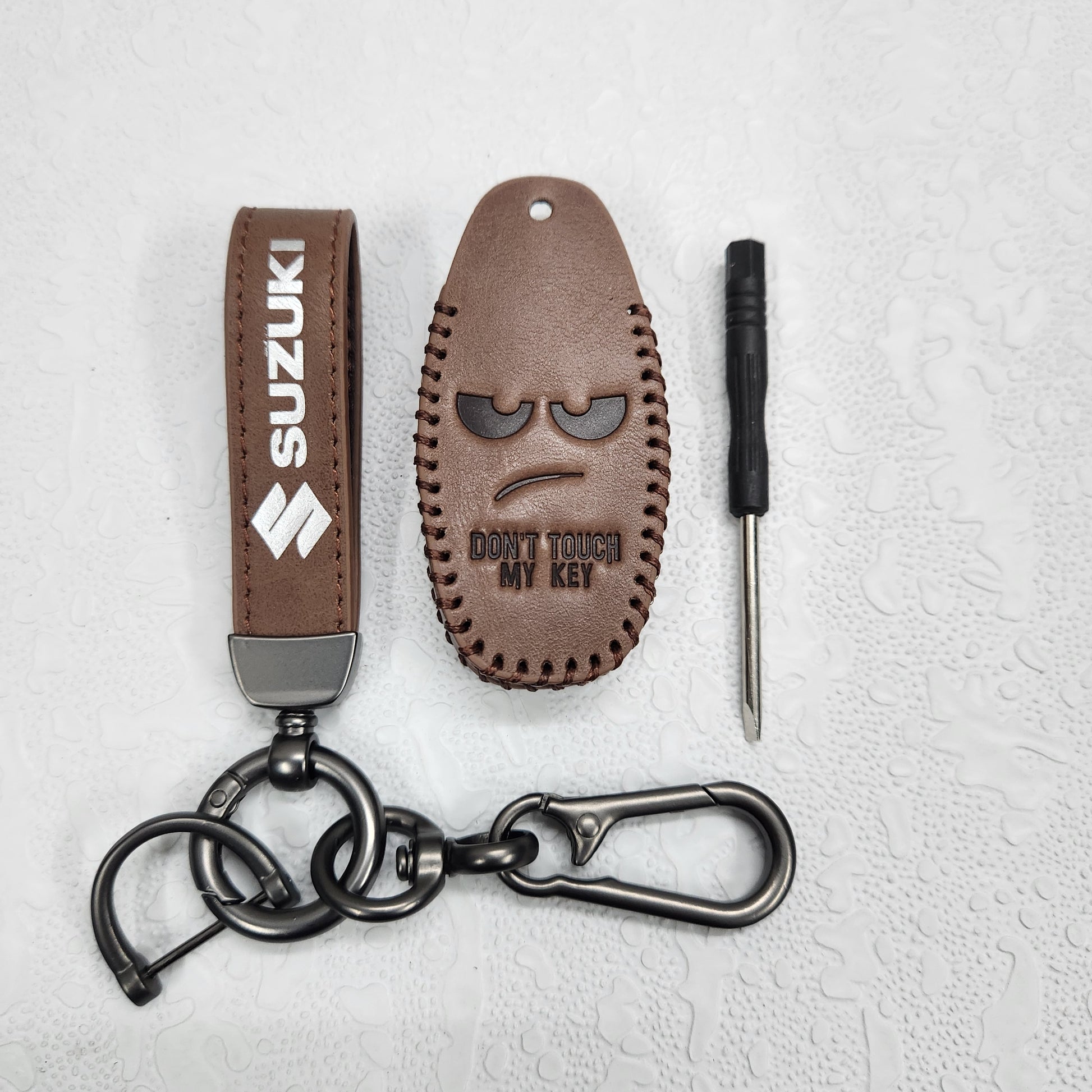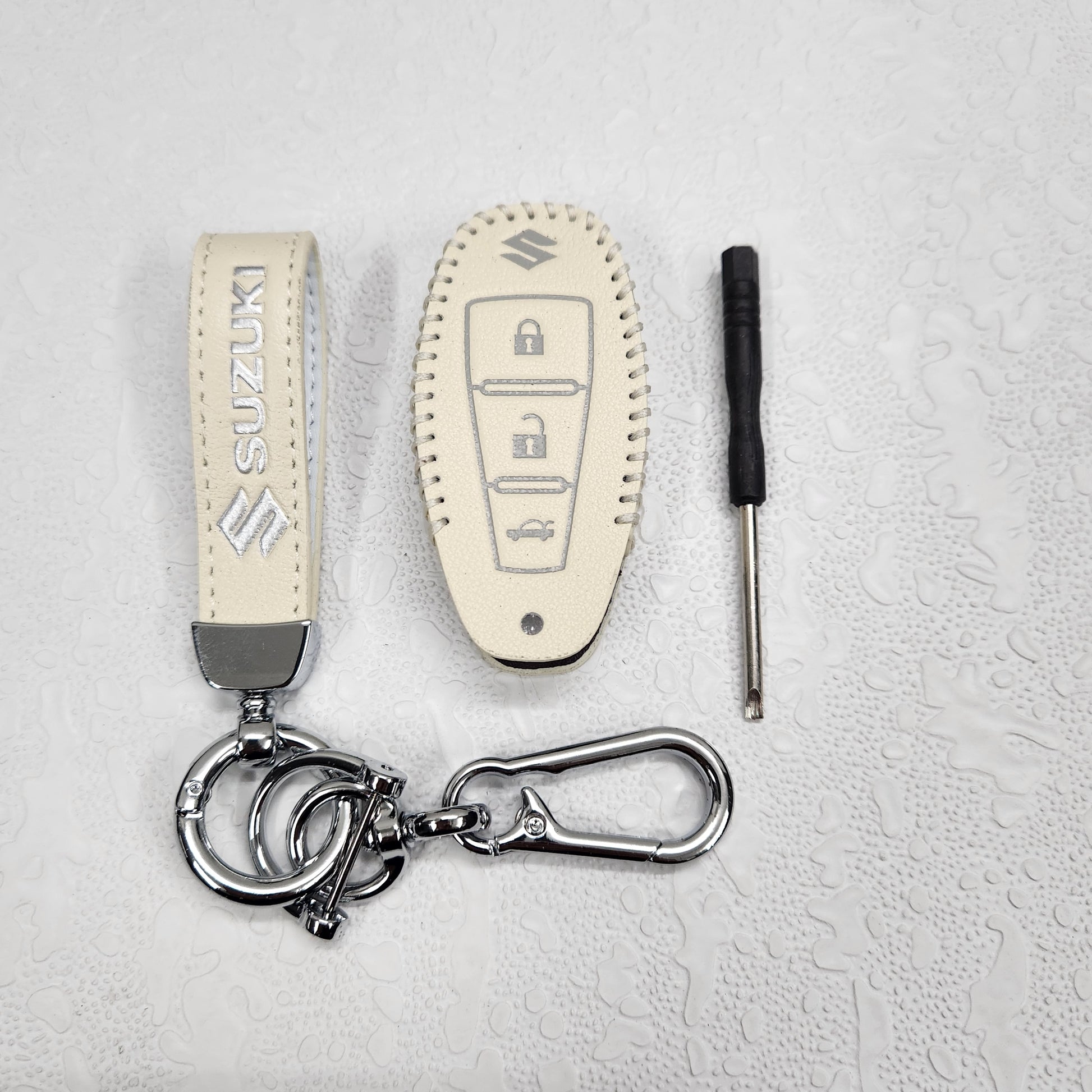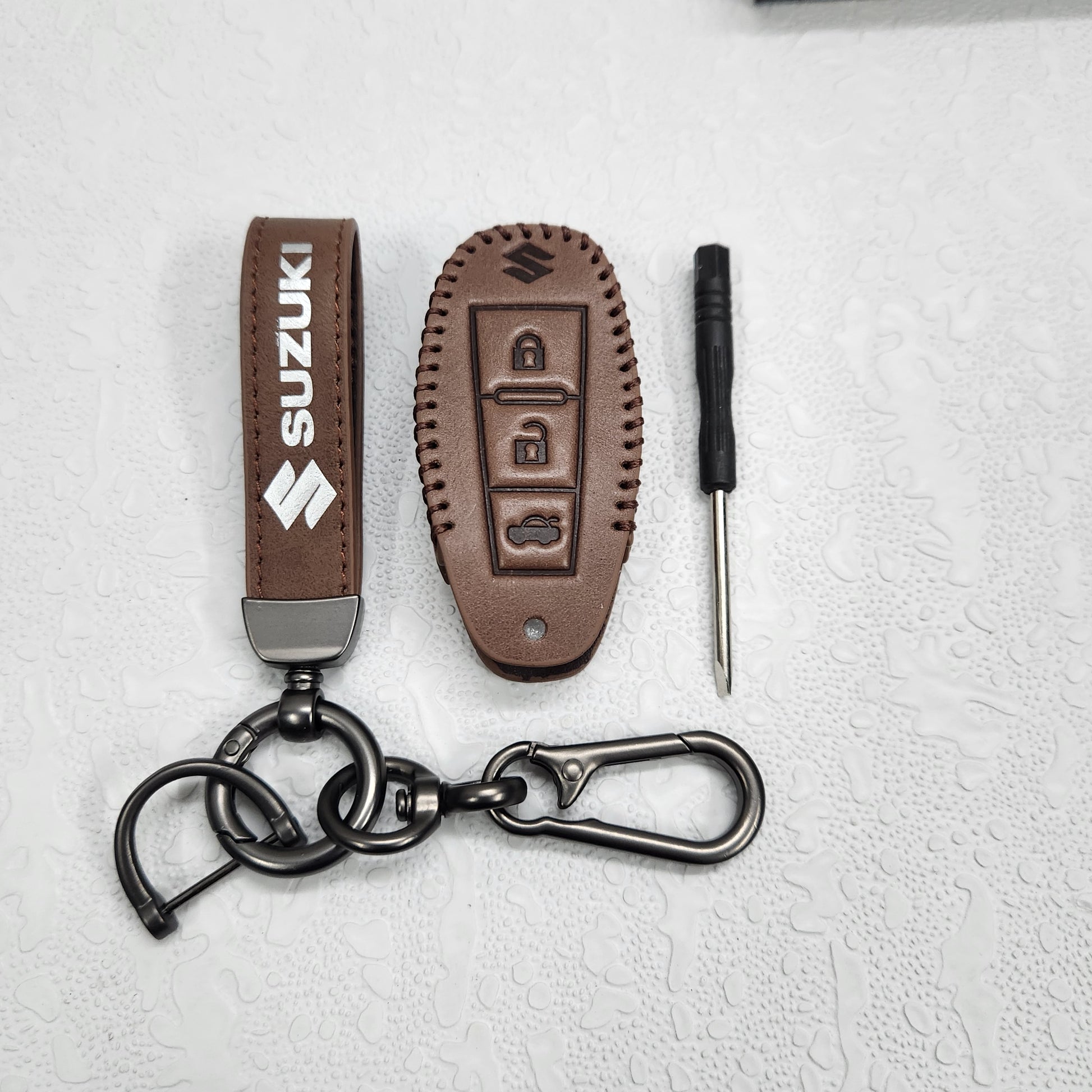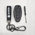 Suzuki Ciaz/Baleno/Scross 3 Button Key Luxury Pure Handmade Oilwax Leather Keycase with Logo, Caption, Hook, and Chain